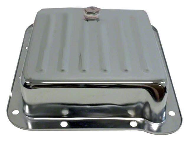 Ford C4 chrome steel transmission pan. Pan fill style and includes drain plug. Stock capacity. Depth: 2-3/8".