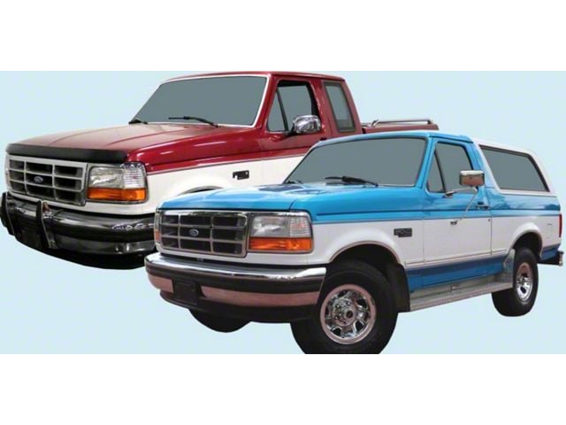 This 1992 1993 1994 1995 1996 1997 Ford F250 F350 F450 Super Duty Tu-Tone Truck Stripe Kit is a 19-Piece, 2-Color Kit. Upper stripes are a 7-Band configuration. Lower Stripes are a 5-Band configuration. Just like original Ford. Printed in OEM correct, original colors, including metallics. We use High Performance, Automotive Grade, 2ml, Cast Vinyl. The best quality available. Fits long-bed and short-bed.