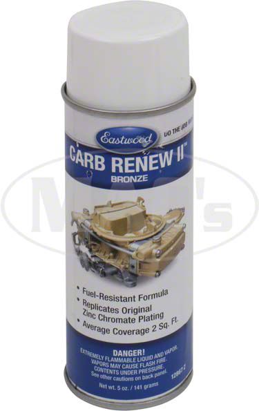 Newly reformulated Carb Renew2 has better fuel resistance and durability than the original formula, but still maintains that factory bronze look - Restore the OEM look found on just about any carburetor. Fuel-Resistant Formula Replicates Original Zinc Chromate Plating Produces a natural 3-8% gloss Average Coverage 2 sq. ft. Carb Renew2 is a translucent acrylic enamel that is resistant to fuel and most additives. (Please read and follow label instructions carefully.) While your carburetor is apart and all jets are removed, simply spray Carb Renew2 on the exterior of the thoroughly cleaned bowl cover and main body. Carb Renew2 comes in a 5 oz. aerosol, enough to cover about 2 sq.ft.