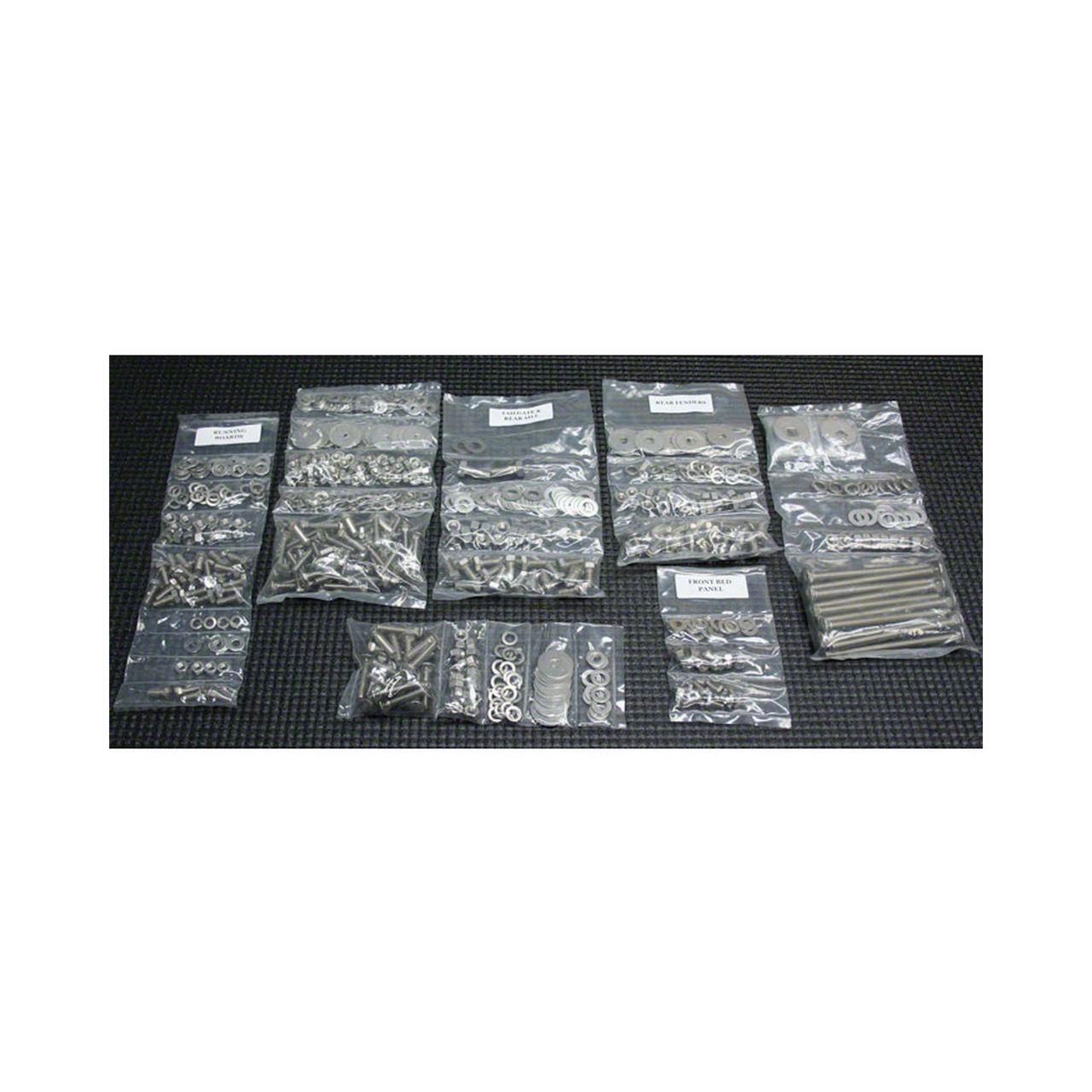 This kit is great! High grade polished stainless steel fasteners are used throughout. Complete kits include all the bolts necessary to put your complete bed together including fasteners to install bed strips, side angles on a stepside.