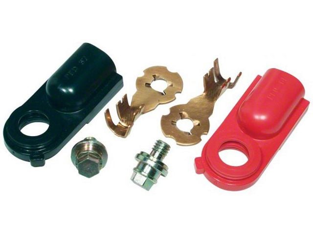 Here's a kit which will allow you to repair newer GM battery cables, or fabricate side-post cables for older models. It includes heavy duty 0-2 gauge terminals, a molded red cover, a molded black cover, and plated bolts. We recommend "tinning" the bare wires before clamping the terminals on to improve the overall connection. You will need to form the wide part of the crimping area around the wire and make sure it grips very tightly all the way around. The smaller portion of the crimping area is to be formed around the insulation/sheath part of the cable. Once done, simply slip the molded end on and insert the plated bolts.