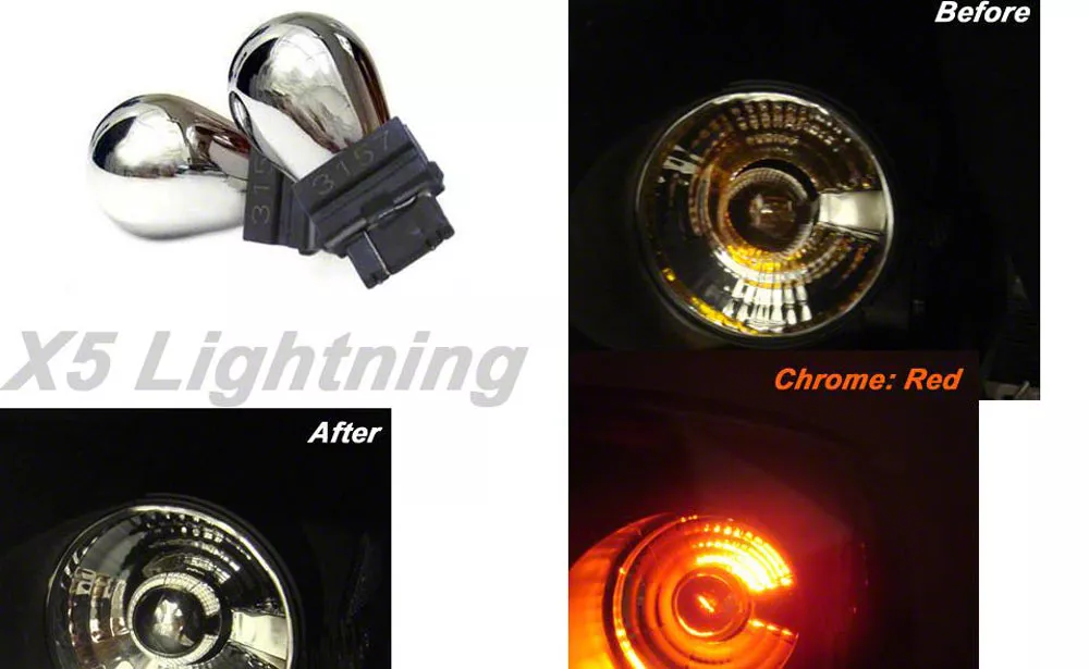 Silver (chrome) bulbs take away the ugly orange reflection seen from orange bulbs in crystal headlights and taillights, but still shine bright Red when illuminated allowing you to complete the clean look along with being 100% legal and requiring ZERO wiring