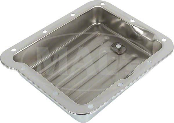 This Ford C4 chrome steel transmission pan is the case fill style and includes a drain plug. The chrome will really brighten up your undercarriage.