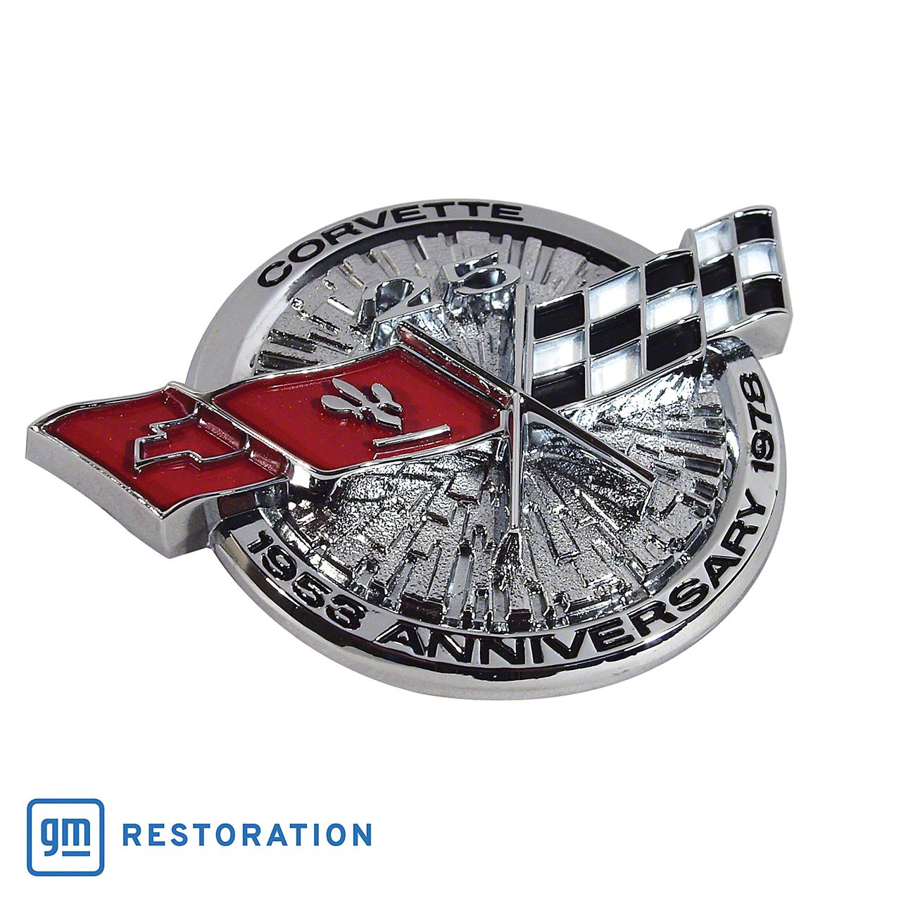 Celebratory Styling Tribute. This CA 25th Anniversary Gas Lid Emblem commemorates Corvette’s quarter-century milestone with a bold raised script and crossed flags logo, adding an authentic period-correct accent to the fill-neck cover on your C3.