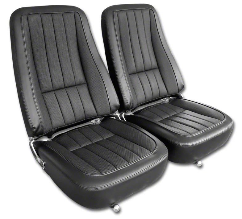 CA Driver Series Leather/Vinyl Complete Seats without Headrest Bracket; 2nd Design; Black (1968 Corvette C3)Find parts that fit my vehicle