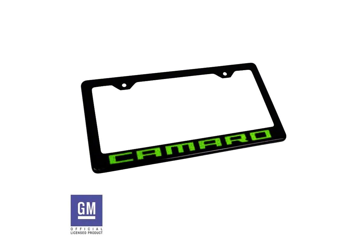 License Plate Frame with Lime Green Camaro Script; Matte Black (Universal; Some Adaptation May Be Required)