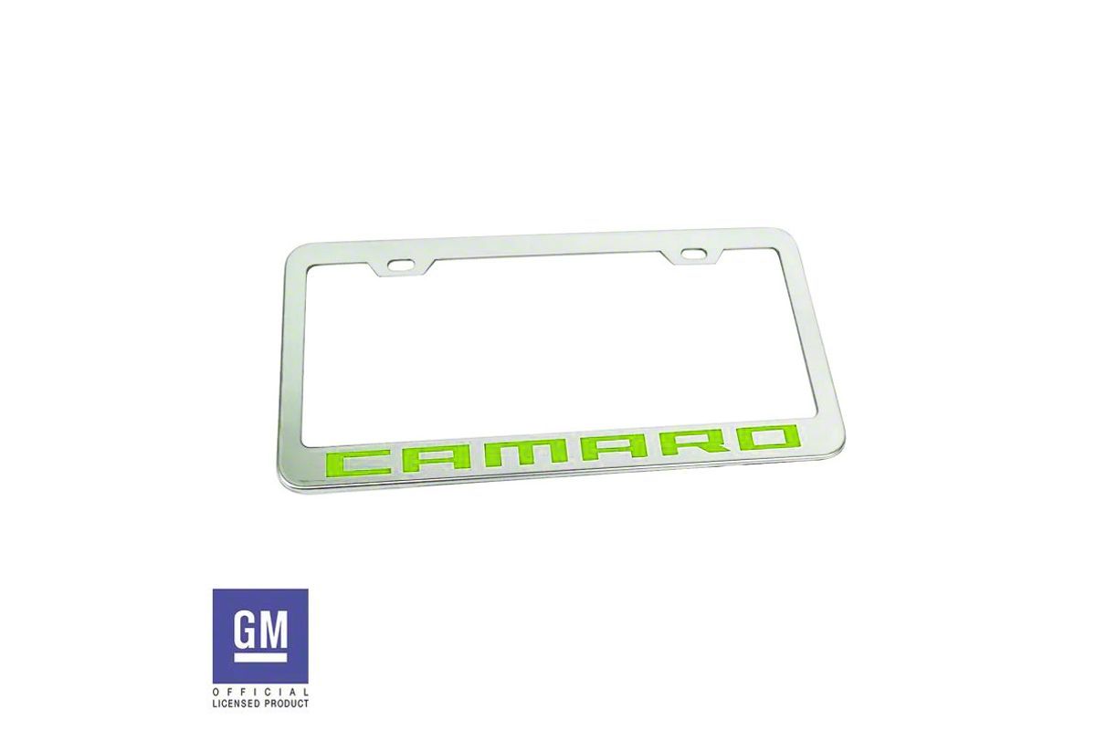 License Plate Frame with Lime Green Camaro Script; Polished Stainless Steel (Universal; Some Adaptation May Be Required)