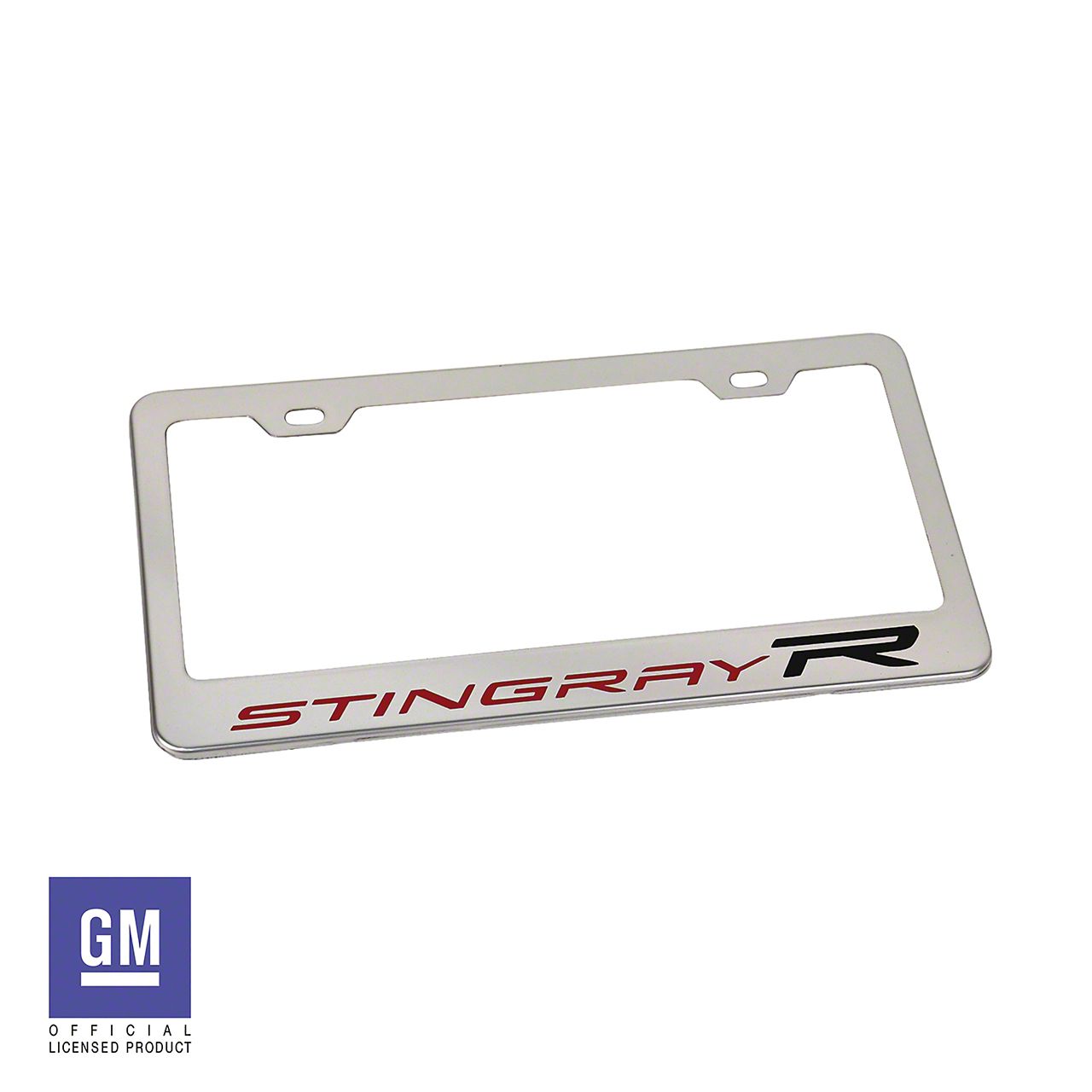License Plate Frame with Red and Black Stingray R Logo; Polished Stainless Steel (Universal; Some Adaptation May Be Required)