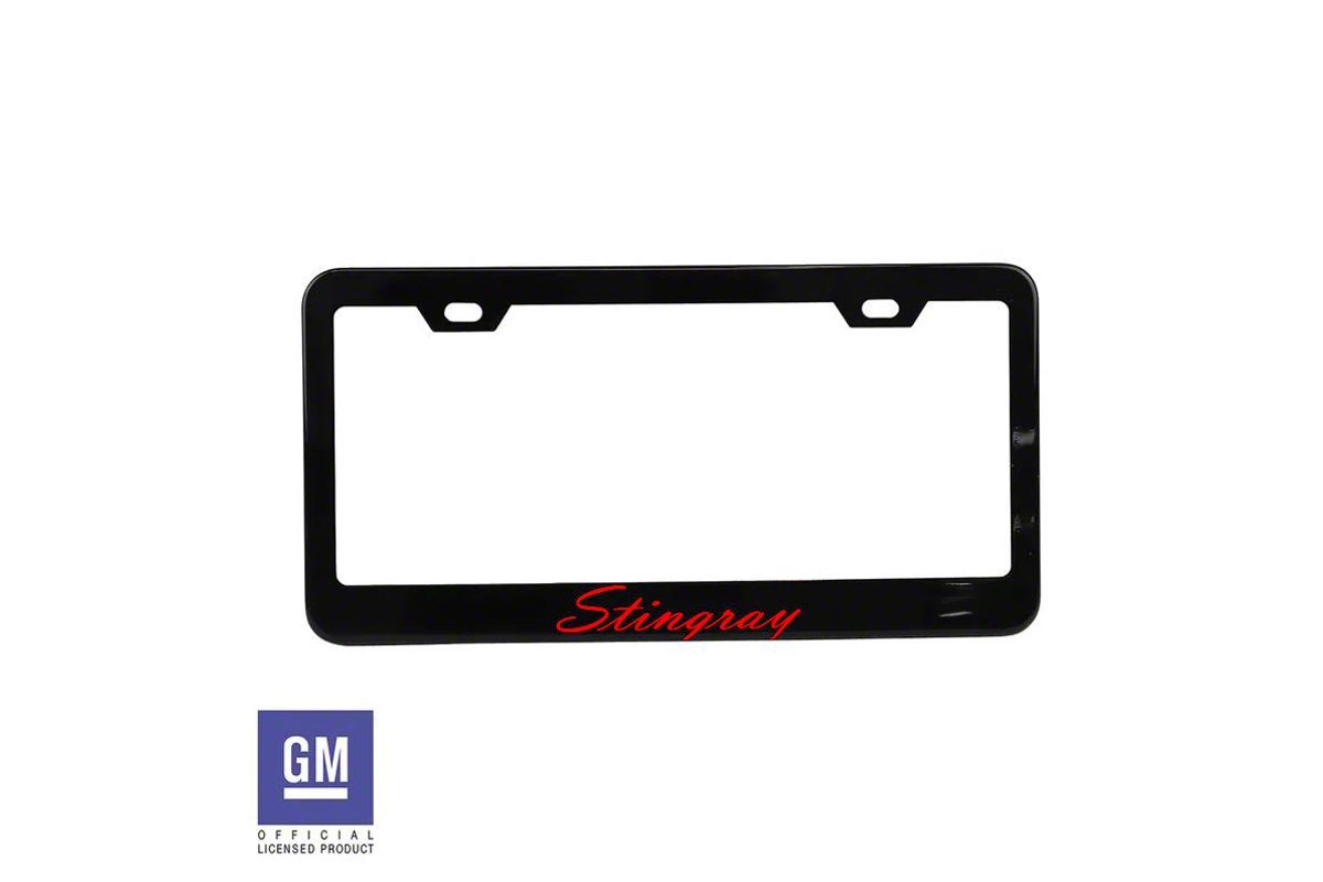 License Plate Frame with Red Stingray Script; Matte Black Stainless Steel (Universal; Some Adaptation May Be Required)