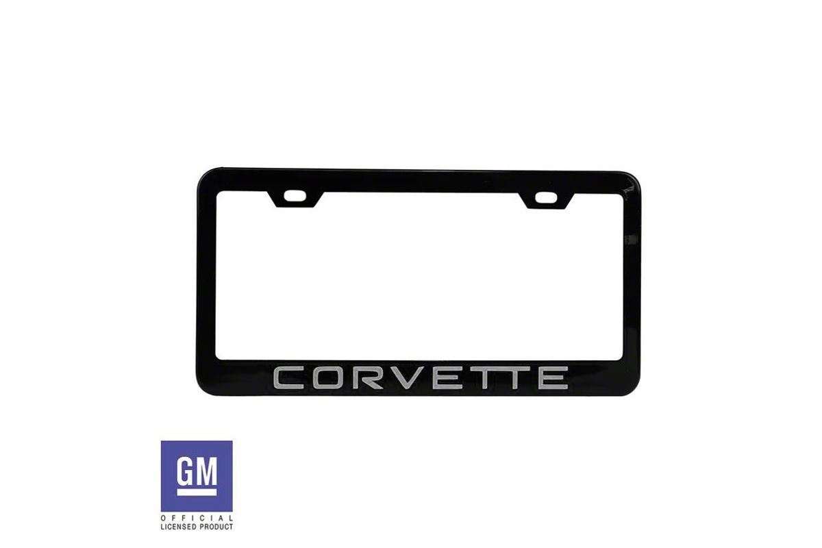 License Plate Frame with Silver Corvette Script; Matte Black Stainless Steel (Universal; Some Adaptation May Be Required)