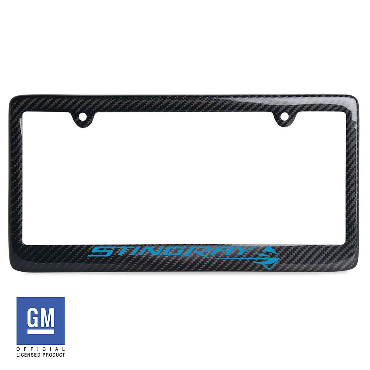 License Plate Frame with Tension Blue Stingray Script and Logo; Carbon Fiber (Universal; Some Adaptation May Be Required)