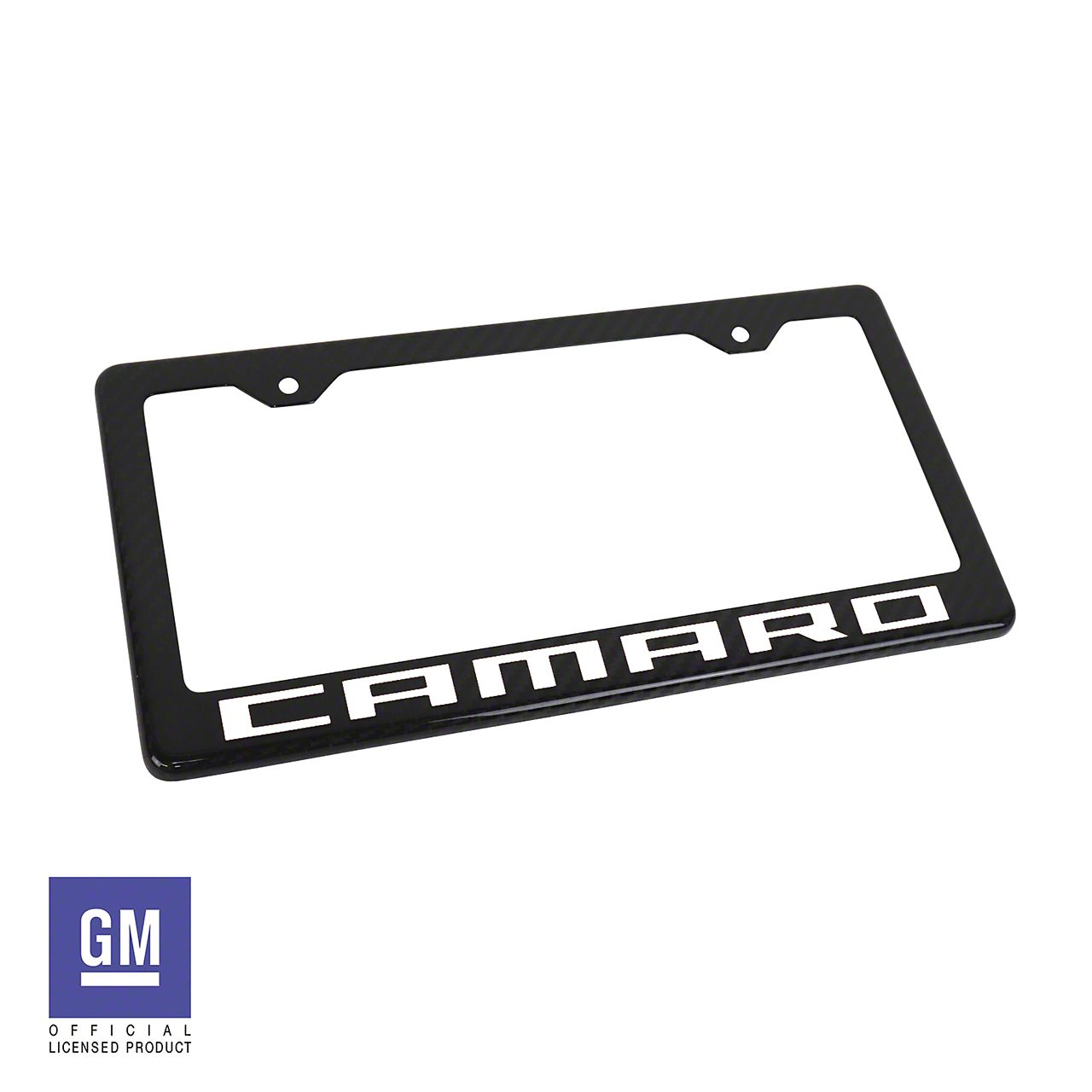 License Plate Frame with White Camaro Script; Carbon Fiber (Universal; Some Adaptation May Be Required)