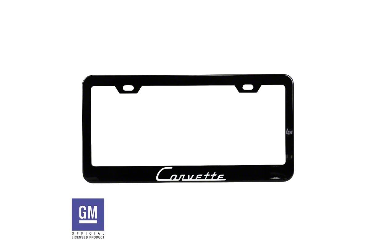License Plate Frame with White Corvette Script; Matte Black Stainless Steel (Universal; Some Adaptation May Be Required)