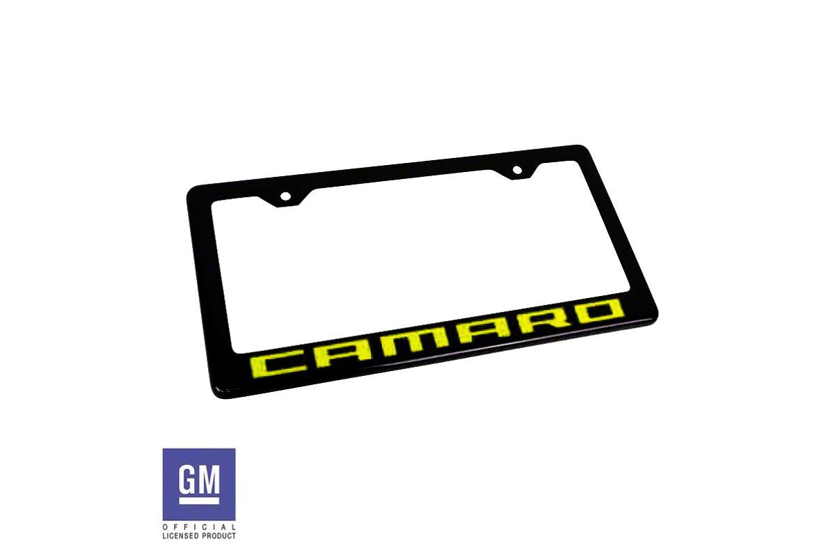 License Plate Frame with Yellow Camaro Script; Matte Black (Universal; Some Adaptation May Be Required)
