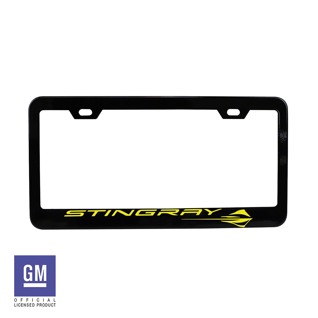License Plate Frame with Yellow Stingray Script and Logo; Matte Black (Universal; Some Adaptation May Be Required)