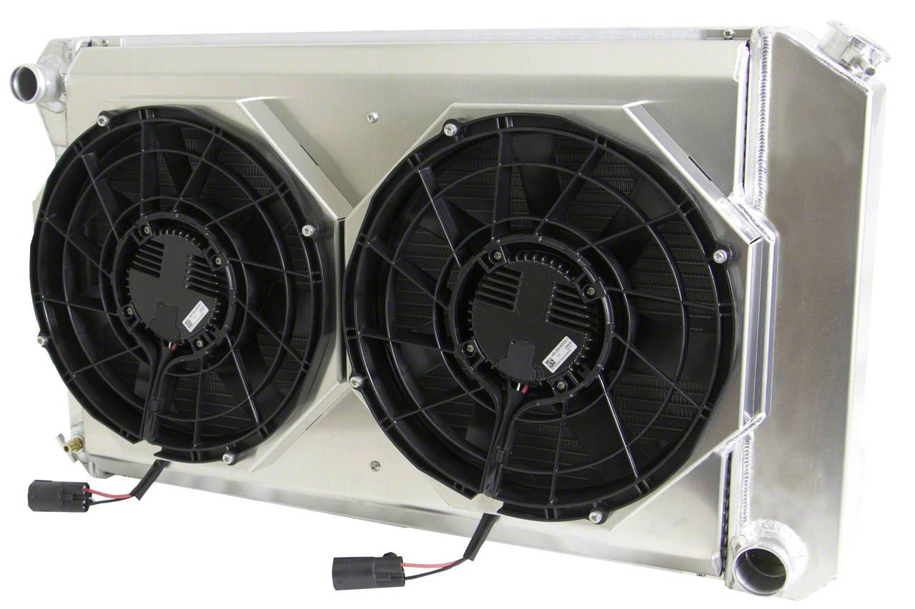 A true high performance radiator built right here in the USA! This radiator is built with 2 rows of 1.25" tubes, making it the same thickess as a 5 row copper/brass radiator but will perform like a 6 row. Since this unit is built for application with a automatic transmission, there is a high performance internal transmission cooler in this radiator. The core is fully brazed and contain NO Epoxy. Super high efficiency fin design with a louver count on each fin exceeding other cores in the market. The fans are the best in industies. The benefits of these dual SPAL 300 watt brushless fans are- they extremely powerful, move tons of air, high torque, quieter than brush fans, and are variable speed. This package is 6.5" thick, so check your space before ordering!
