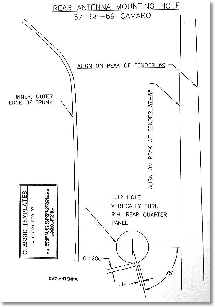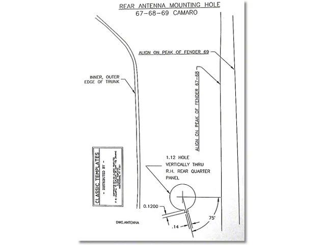 If you have had to replace your fender of quarter panels on your 1967, 1968, or 1969 first generation Camaro, you may have noticed a slight problem regarding your rear antenna. Your new quarter panel does not come with a properly aligned pre-drilled hole for your antenna assembly! Rick's Camaros is here to solve your problems with this antenna template for your rear antenna installation for your F-Body. This template accurately positions the location of your rear antenna body hole. It is easy to use, and the full size digitally rendered placement guide locates the exact rear quarter panel location, quickly and professionally. This template ensures that the holes through your rear panel is properly aligned to allow the antenna to rise and lower effectively. It will look like the factory