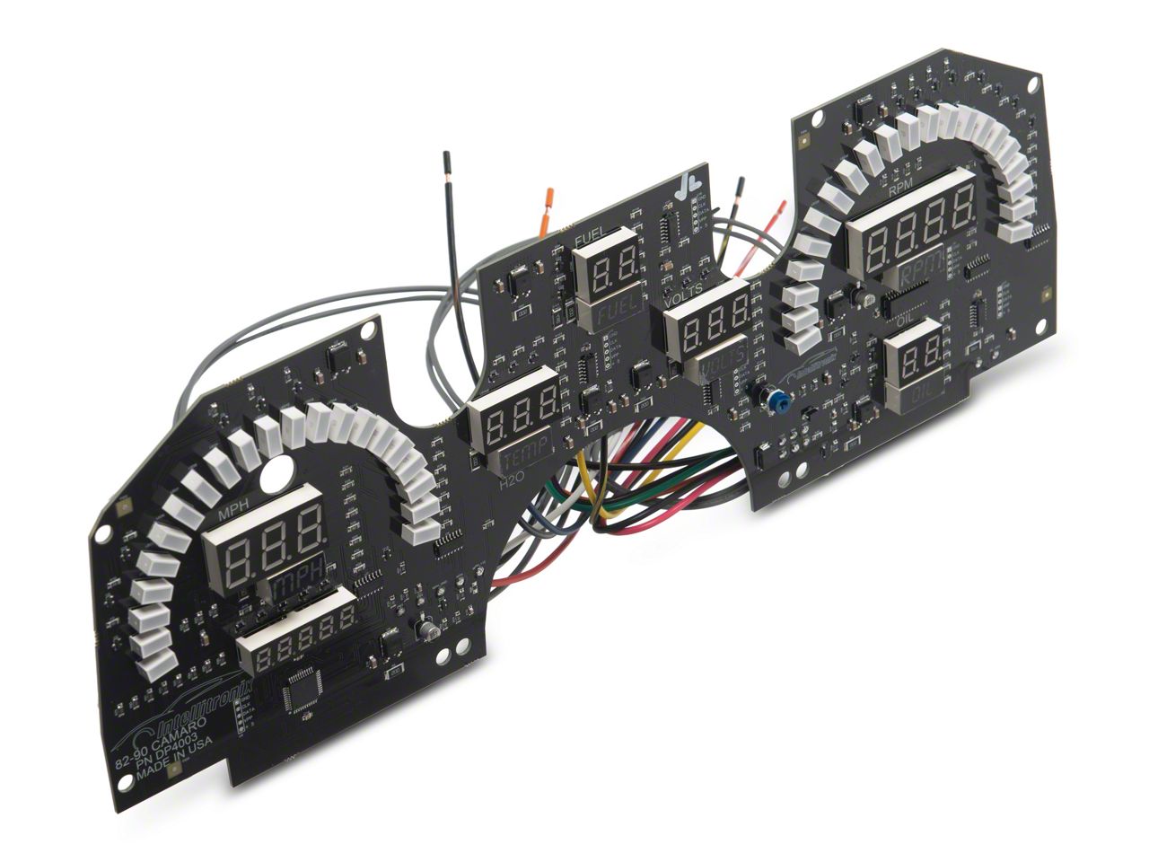 The full dash gauge panel on your 1982, 1983, 1984, 1985, 1986, 1987, 1988, 1989, or 1990 Camaro can go through a lot over the years. Whether the gauge clusters get scratched or faded, or the lights start to burn out, or you simply feel the need for a chance in your car's interior, look no further. Rick's Camaros is proud to offer this brand new third generation Camaro digital dash panel, coming complete with a direct fit circuit board, custom-fit "smoke" Plexiglas face plate, and universal temperature sending unit. This direct factory replacement unit works with your factory fuel level, oil pressure sending unit, and cruise control sender or electronic transmission output, if equipped. This new panel, complete with gauges and clusters, includes a speedometer reading up to 2