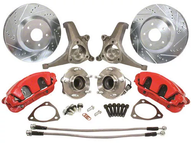 Upgrade your 1970-1981 Camaro with this new C5 Style Spindle Upgrade Kit, from Ricks Camaros. This kit comes with the C5 Style Bearing (Hub) which by utilizing this type of sealed bearing, flex on the factory spindle axle pin, which causes caliper piston push back and an unpredictable brake pedal, is eliminated. The condition is especially a problem on aftermarket big brake kits. This kit comes complete with 13" Drilled rotors, loaded calipers and hardware to mount them, for your 1970, 1971, 1972, 1973, 1974, 1975, 1976, 1977, 1978, 1979, 1980, 1981 Camaro. Trust Ricks Camaros for all your part needs.