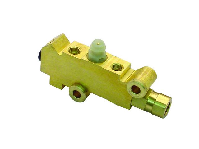 The PV-2BH Brass Proportioning Valve is designed for use in systems with front disc brakes and either rear drum or disc brakes. This hybrid design is ideal for vehicles currently equipped with rear drum brakes that may be upgraded to disc brakes in the future. It features a 1/2 x 20 inlet for the front master cylinder and a 7/16 x 24 inlet for the rear master cylinder, with outlets measuring 3/8 x 24 for the front (two ports) and 9/16 x 18 for the rear. This GM-style proportioning valve ensures proper distribution of brake fluid pressure to both the front and rear wheels while maintaining separation between the two systems. It also includes a single wire brake light warning switch, with the wire (SP015130) available separately if needed.