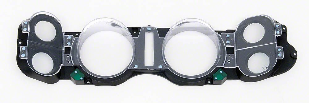 The 1970-78 Camaros had two styles of Instrument Clusters. Cars without the factory gauge package were equipped with only a speedometer and fuel gauge. The other functions were handled by warning lights. This is a dash lens assembly for a Camaro with factory dash gauges.