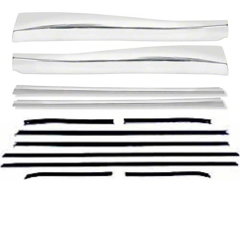 Correct reproduction of the original outer door ledge reveal molding and window felt weatherstrip for 1968 Camaro convertible models. The moldings are manufactured in quality stamped aluminum with a polished chrome plated finish. Originally installed on 1968 RS Camaro models with custom exterior package. This special molding measures approximately 1-1/2" wide. Sold in sets that include 4 exterior moldings and the 8-piece window felt weatherstrip set for door and quarter windows.
