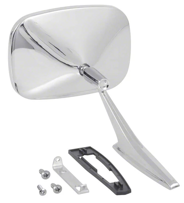 Original style replacement outer door mirror for 1968-72 models. Each mirror features the correct style ribbed base with "dimple" at the top of the base near the mirror head. Each mirror is manufactured in zinc die-cast material, chrome plated, and polished to perfection. Included with each mirror is the door-to-mirror mounting bracket, molded gasket, and retaining installation hardware. Replacement style mirror similar to original GM design.