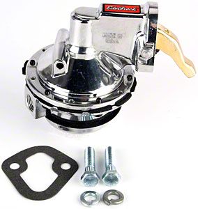 Designed to match Performer Series carburetors, Edelbrock's High-Performance Street Fuel Pumps have 6-valves and a flow capacity of 110 gph. The unique valve design improves flow quantity and quality, and will support engines up to 600hp. High-volume, 3/8'' NPT inlet and outlet surpasses the capacity of conventional models. Produces 6 psi. For gasoline or mixed fuels only. No Regulator required. Clockable lower housing can be rotated for inlet/outlet alignment.