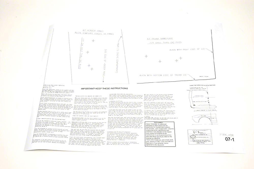 When you decide to install new emblems and body moldings to the sheet metal of your 1967 Chevrolet Camaro, it can be daunting to get started. You want an exact fit on your Rally Sport, but you might lack the proper materials. Rick's Camaros is happy to be your solution, by offering the best emblem and body template kits for your F-Body. These easy to use full-size digitally rendered emblem placement templates will exactly locate all body, fender,hood, header, and trunk lid emblem holes quickly and professionally. We also offer templates for lower body moldings, rear quarter panel louvers, backup lamps, antenna hole placement, sidemarker locations, and fenderwells. Don't spend another moment agonizing on how to best apply your new emblems or body components. Make the job easy! Trust Rick