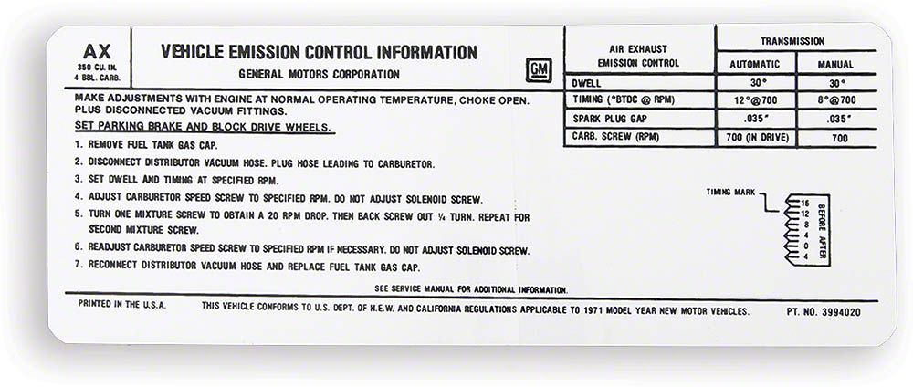 Emission Decal, Automatic Or Manual Transmission, California, 350ci/300hp 4-Barrel Carb (1971 Camaro)Find parts that fit my vehicle