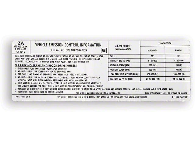 Emission Decal, Automatic Or Manual Transmission, US, 350ci & 400ci 2-Barrel Carb (1974 Camaro)