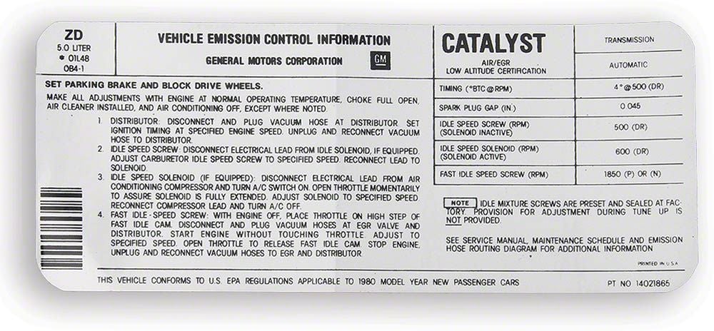 1980 Camaros sold in California and New York came factory with certain smog requirements including a visible emissions decal under the hood. Many states now have adopted California and New York standards above Federal standards setting the bar that much higher requiring in many cases clear display of these labels and decals. All 1971 and newer Camaros have emissions labels or decals showing that they were manufactured to meet either California or U.S. Federal standards. This Camaro emissions label or decal is affixed in the engine compartment or in a readily accessible location. At the top of this 1980 Camaro Emissions label are the words VEHICLE EMISSION CONTROL INFORMATION and the corporate name or tra