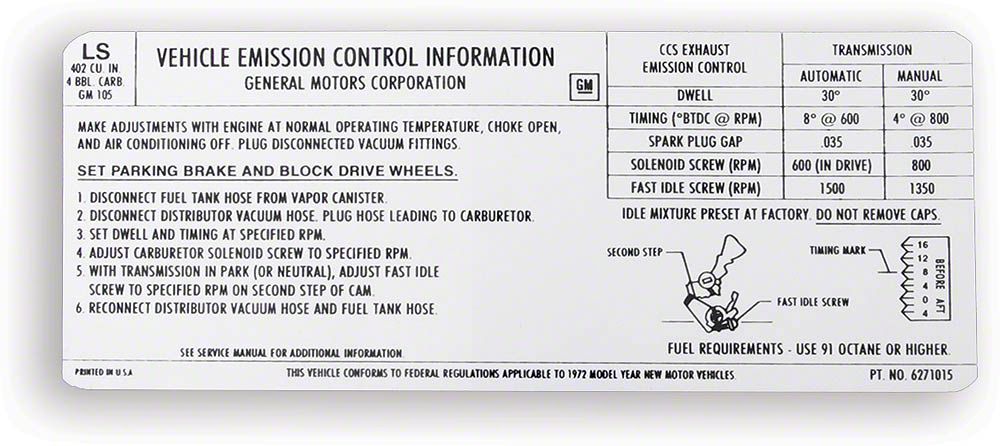 1972 Camaros sold in California and New York came factory with certain smog requirements including a visible emissions decal under the hood. Many states now have adopted California and New York standards above Federal standards setting the bar that much higher requiring in many cases clear display of these labels and decals. All 1971 and newer Camaros have emissions labels or decals showing that they were manufactured to meet either California or U.S. Federal standards. This Camaro emissions label or decal is affixed in the engine compartment or in a readily accessible location. At the top of this 1972 LS Camaro Emissions label are the words VEHICLE EMISSION CONTROL INFORMATION and the corporate name or tradema