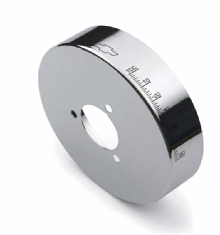 1969, 1970, 1971, 1972, 1973, 1974, 1975, 1976, 1977, 1978, 1979, 1980, 1981, 1982, 1983, 1984, 1985 Camaro small block Chevrolet engine is durable and avalible for dress up items. Ricks Camaros offers this Harmonic Balancer Cover for 6-3/4" balancer for small block chevrolet engines. This cover eliminates the need for the timing tab, mounts directly to the center hub, eliminates outer ring inertia slippage, is made from high quality aluminum and has the classic Chevrolet Bowtie engraved in the cover. Your 1969, 1970, 1971, 1972, 1973, 1974, 1975, 1976, 1977, 1978, 1979, 1980, 1981, 1982, 1983, 1984, 1985 Camaro engine will never look better. Trust Ricks Camaros for all your parts needs.