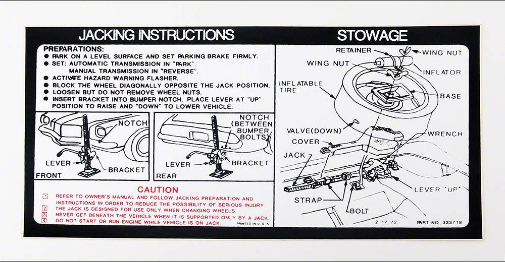 This Camaro reproduction jacking instructions decal has been manufactured to original factory specifications using today's modern manufacturing techniques. You will find the quality & appearance will work superbly for your restoration. In addition, using a reproduction jacking instructions decal from Eckler's will add authenticity and value to your Camaro.