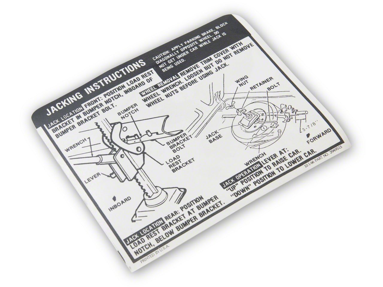 This Camaro reproduction jacking instruction decal has been manufactured to original factory specifications using today's modern manufacturing techniques. You will find the fit, finish and function will work superbly for your restoration. In addition, using a reproduction jacking instruction decal from Rick's will add authenticity and value to your vehicle.