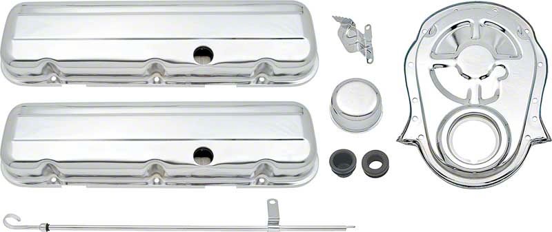 Dress up your Chevrolet Big Block engine in brilliant show quality polished chrome with this engine dress up set. Includes the basic components needed to make your engines appearance shine! Features low profile valve covers. Will fit Chevrolet 396, 427, 454 big block engines.