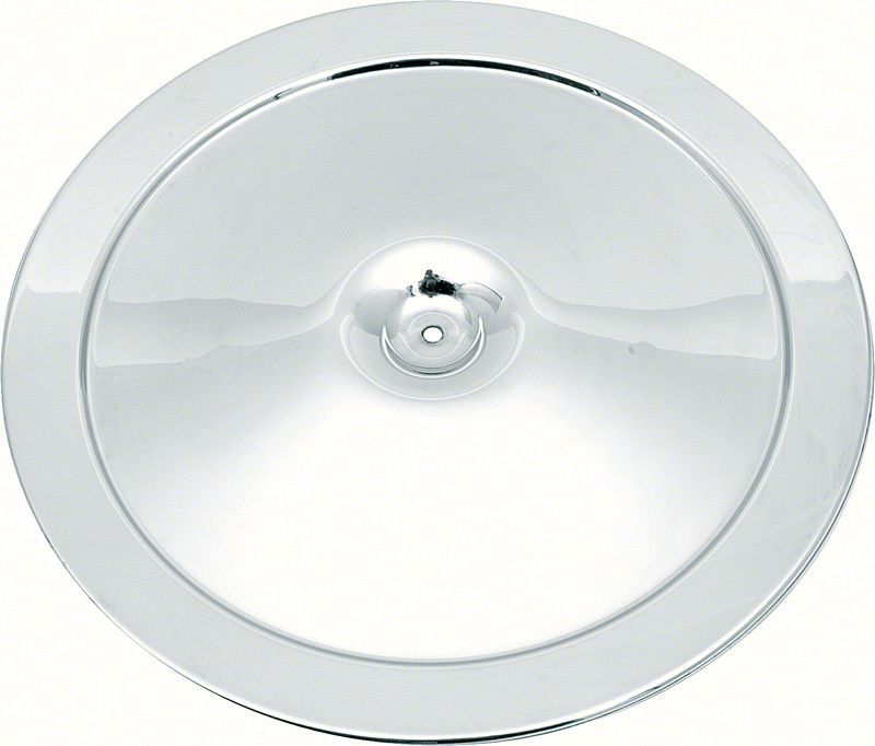 High-Performance Air Cleaner Lid. The Open Element Chrome Air Cleaner Lid with Curved Imprint Verbiage; 14-Inch is designed to replace or upgrade factory air cleaner lids on classic Chevy engines. It serves to protect the air filter while maintaining the original look and functionality necessary for performance vehicles. Proper air filtration is critical to engine health and efficiency, making this lid an essential restoration or maintenance part for enthusiasts.