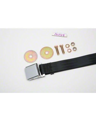This is a black two point lap belt for the rear seat belt assembly for the 1955-80 models. The belt features a chrome lift latch buckle. All seat belts are 60 in length. Installation hardware included. Each does one person (seat).