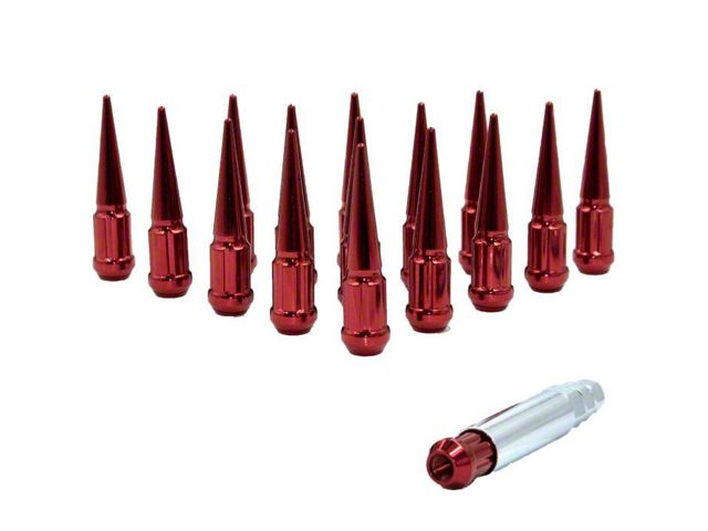 Premium Bulge Acorn Lug Nuts. Give your Chevrolet Camaro a standout look with the Red Spike Lug Nut Kit, featuring M12 x 1.5 spline drive spike lugs. These uniquely designed lug nuts not only enhance the visual appeal of your Chevrolet Camaro with their bold red color and aggressive spike design but also ensure superior security and durability.