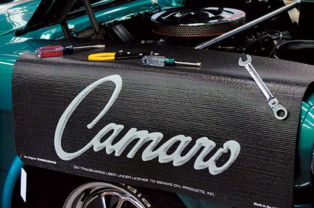 Great accessory for the man cave or garage. The spongy-sticky feel of this fender cover allows for the ultimate protection of your expensive paint job. The cushion will absorb most dropped wrenches and protect against the dreaded "belt buckle" or jacket zipper scratch while the stickiness will keep tools and bolts in their place while you are wrenching on your Camaro. Buy one for each fender today and protect your investment with quality tools and accessories from Rick's Camaros.