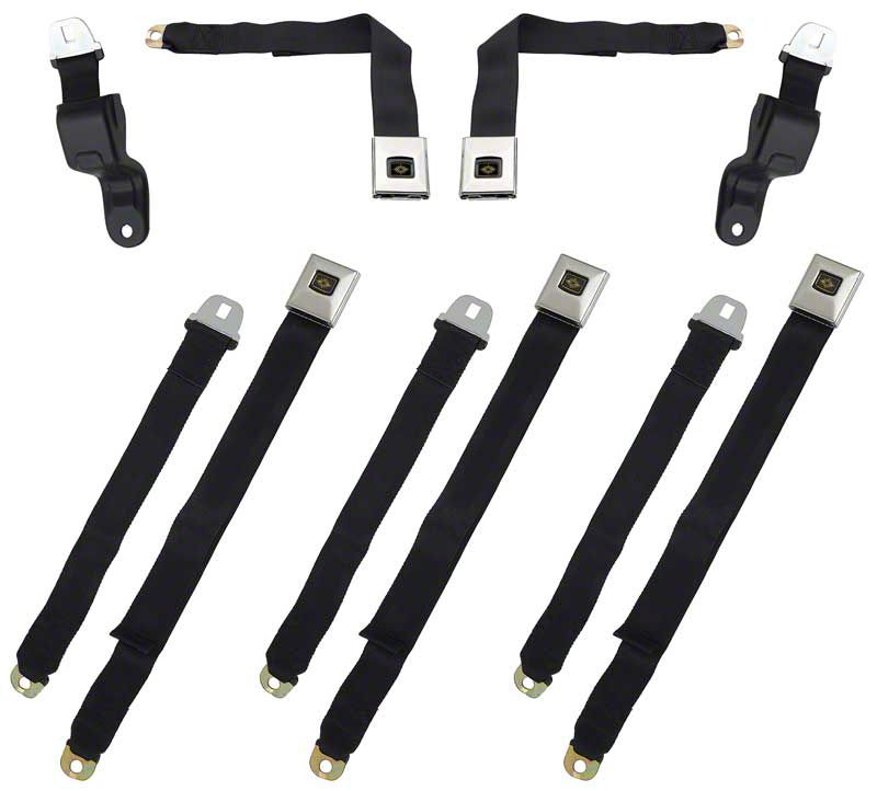 1967 Camaro/Firebird; Retractable Seat Belt Set; Deluxe Interior; Gold Starburst Button; Black Belts; 5-Piece Set