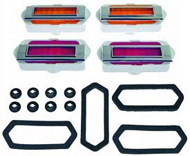 _x000D__x000D_Construction and Appearance. The kit features chrome die cast bezels that offer durability and a polished look. Lens assemblies are amber for the front and red for the rear, finished with detailed text and script matching original specifications. A die-cut foam seal set is included to ensure a secure and original fitment. All components come packaged neatly in a branded, color logo box.