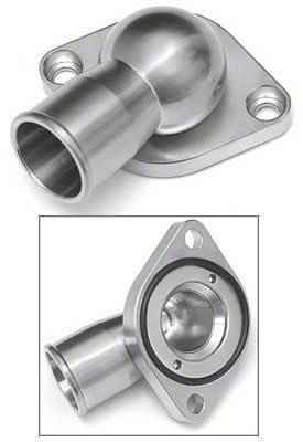 "Trick" doesn't begin to describe this thermostat housing. Made from machined type 304 stainless steel and available in either natural or polished, the ultra low profile design allows clearance for Ram Jet or blower applications. The innovative 15-degree angle neck, sealed with an O-ring, swivels a full 360 degrees to align perfectly with the radiator hose. A second O-ring seal prevents any coolant leaks at the intake manifold. Stainless steel mounting bolts complete the super sanitary installation on either small or big blocks.