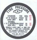 This Camaro reproduction tire pressure decal has been manufactured to original factory specifications using today's modern manufacturing techniques. You will find the fit, finish and function will work superbly for your restoration. In addition, using a reproduction tire pressure decal from Rick's will add authenticity and value to your vehicle.