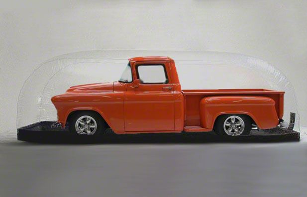 Did you ever wish you could seal your perfectly polished and detailed car into its own protective bubble, keeping it safe from dings condensation and all the environmental gremlins that slowly turn it from new to old. Well, now you can, with the ingenious Car Capsule. You just drive your car onto the laminated fabric basemat, then zip the durable, clear 10 mil PVC bubble over the top. A built-in fan and filter provides a continuous flow of dry, filtered air while your car rests inside, preventing rust from condensation. The Car Capsule Operates for approximately $1.50/month. US Patent No. 4991363.