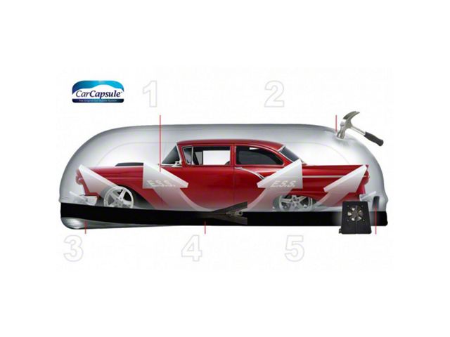 Did you ever wish you could seal your perfectly polished and detailed car into its own protective bubble, keeping it safe from dings condensation and all the environmental gremlins that slowly turn it from new to old. Well, now you can, with the ingenious Car Capsule. You just drive your car onto the laminated fabric basemat, then zip the durable, clear 10 mil PVC bubble over the top. A built-in fan and filter provides a continuous flow of dry, filtered air while your car rests inside, preventing rust from condensation. The Car Capsule Operates for approximately $1.50/month. US Patent No. 4991363.