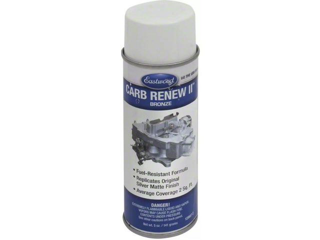 Newly reformulated Carb Renew2 has better fuel resistance and durability than the original formula, but still maintains that factory silver look - Restore the OEM look found on just about any carburetor. Carb Renew2 is a translucent acrylic enamel that is resistant to fuel and most additives. While your carburetor is apart and all jets are removed, simply spray Carb Renew2 on the exterior of the thoroughly cleaned bowl cover and main body. Produces a natural 3-8% gloss. Carb Renew2 comes in a 5 oz. aerosol, enough to cover about 2 sq.ft.