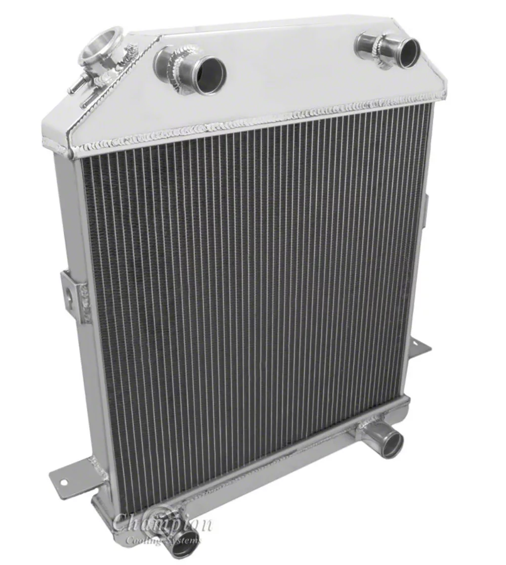 Your classic Ford can get hot... really hot! Driving and idling in traffic on 90+ degree summer days can push your stock cooling system to its limits... and unfortunately, beyond. Factory brass radiators are barely satisfactory at transferring heat, which is why they overheat when you least expect it. Why take chances with your valuable engine? Step up to Champion's all-aluminum, high efficiency radiator. Aluminum alloy is a far superior metal to the original equipment copper-brass construction because it dissipates (or "radiates") heat much more quickly and cools down much more rapidly. Heat transfer from your engine to the atmosphere is greatly increased, thereby lowering the temperature of the engine coolant dramatically. An aluminum radiator will out-cool a copper brass radiator of sim