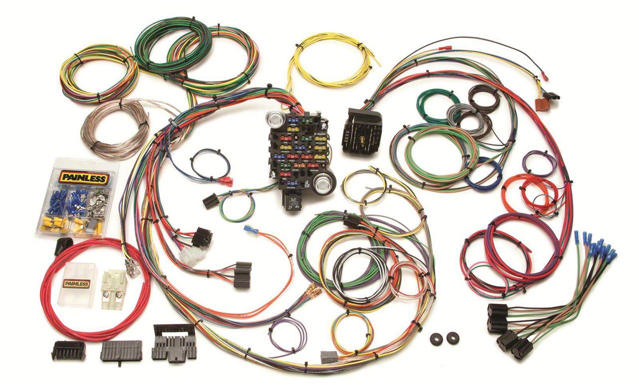Painless Performance 25-Circuit 1969-74 GM muscle car harnesses feature a pre-wired factory style bulkhead connector that plugs directly into the back of the fuse block in the factory location. Factory original quick connect terminals are included for the in dash printed circuit board. Pre-terminated plugs for a column mounted ignition switch, dimmer switch, headlights, headlight switch, blower motor, wiper motor, and turn signal switch. Each wire is custom printed with the circuit identification as well as using GM color codes for easy installation